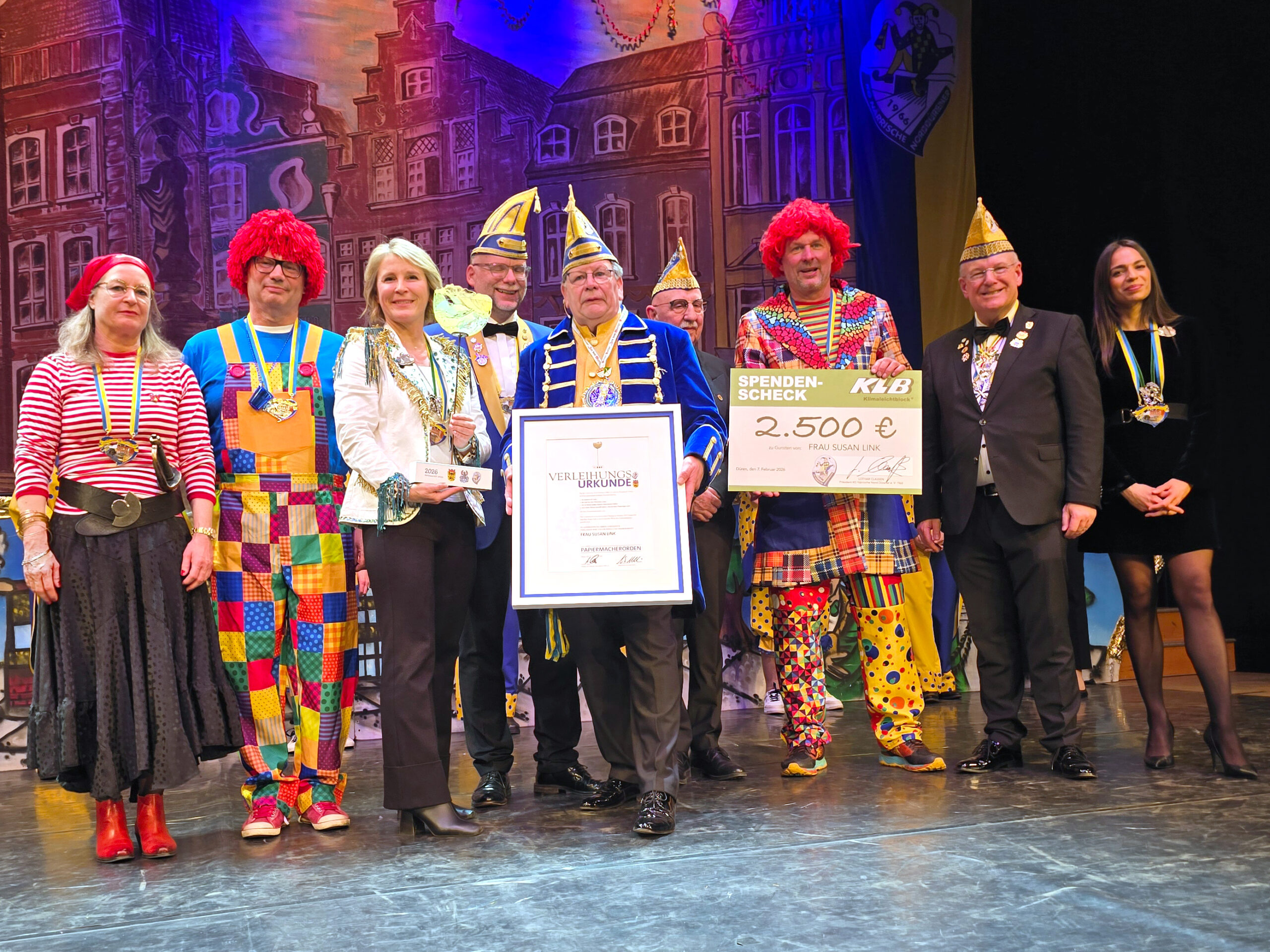 In ihrer charmanten und mit vielen Witzen gespickten Dankesrede versprach Susan Link, sich in Zukunft mehr dem Papier zuzuwenden, zum Beispiel wieder Einkaufszettel zu schreiben und nicht in eine App zu tippen. Außerdem betonte sie die Wichtigkeit des Karnevals, gerade in der aktuellen Zeit: „Es ist wichtig, mal rauszukommen, den Kopf frei zu bekommen. Es scheint so, als hätten die meisten Clowns keine roten Nasen, sondern Anzüge an“, rief sie dem Publikum zu, bevor sie ihre Dankesrede angelehnt an die kürzlich verstorbene Politikerin Rita Süssmuth mit den Worten beendete: „Überlasst die Welt nicht den Wahnsinnigen. Düren Alaaf!“